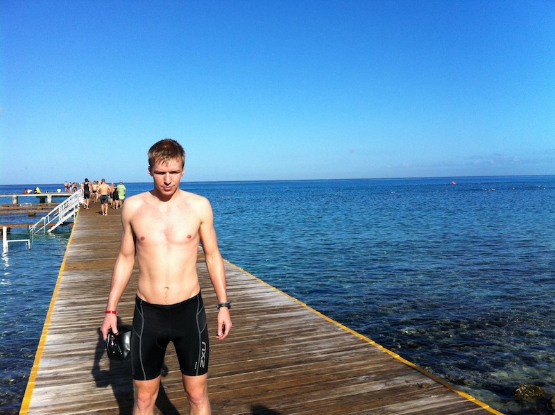 Jørgen Melua som var med på IM Cozumel også i fjor beskrev svømmeetappen som å svømme i et stort akvarium. Det var en veldig god beskrivelse. Vannet er krystallklart og du ser fisker hele tiden. Arrangørene har skrytt på seg at det har verdens fineste svømmeetappe og det tror jeg absolutt på. Mot normalt (for meg som ikke har svømming som favoritt) så var det en flott opplevelse å svømme her. Her kan jeg forstå hvorfor det er mulig å like svømming. Svømmeløypen er kun en stor runde på 3800 m som er formet som en lang rektangel med kraftig motstrøm den ene veien og tilsvarende kraftig medstrøm andre veien. Hvordan dette gir utslag i totalt svømmetid er jeg ikke sikker på men i fjor var hvertfall svømmingen svært rask med bestetid på ca. 44 min. For min egen del håper jeg på å svømme under 1 t og 15 min som er litt seinere en det jeg er «god for» men pga forbud mot våtdrakt og manglende svømmetrening i åpent vann så tviler jeg på at det går særlig raskere. Om vannet er mer salt en sjøvann hjemme er vel heller tvilsomt men det kjennes veldig salt ut så her gjelder det å holde svømmebrillene på når kaoset står på som verst. Nedfor er to bilder fra dagens trening i svømmeløypen.