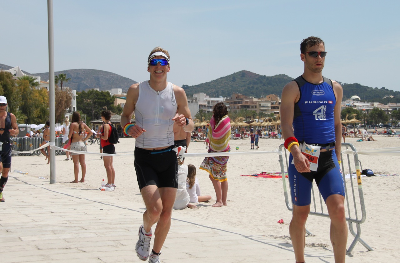 Fy fader for en dag altså! Kort oppsummert kan jeg si halvdårlig svømming, god sykling og perfekt løping. Tiden ble 4:40:03 og nr. 4 av de 23 nordmennene her nede Tidene ble sånn ca. Svøm: 32.30 Sykkel: 2:33 Løp 1:29 + 5.15 i T1&T2. Svømmingen ble bare tøys med ingen oppvarming (som var altfor lite) og dugg i brillene. Etter 750 meter måtte jeg stoppe og skylle brillene siden sikten var lik null. Etterpå gikk det bedre og tiden ble helt ok selv om jeg kunne ha gjort det så mye bedre. Sykkeletappen var kanonfin og underholdende å sykle i. Spesielt nedkjøringen fra Lluc på lukkede veier var artig. 2 t og 33 min var litt bedre en planlagt og en positivt overraskelse. Løpingen var noe for seg selv. En løpeetappe på 1:29 var raskest 3. raskest av alle norske (Øyvind L og Erik G var raskest) og bare 40 sek under persen min på en ren halvmarathon. Første 10 km ble fullført på rett under 40 min som er veldig bra til meg å være. Etterpå gikk det selvsagt saktere, men ikke så myyee saktere. Vannvittig deilig å fullføre i god stil 6 min FØR tidsplanen for en gangs skyld.