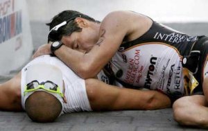 N.B. Jeg vil virkelig anbefale alle å ha en plan på treningen i tiden før konkurranse. På hver IM jeg har vært på virker det som mange trener som gale de siste dagene i forkant. Det både løpes og sykles knallhardt. Det verste eksempelet observerte Jenny på Mallorca da en tysk dame løp til hun kollapset, dagen før konkurransen. Grunnen til at hun kollapset kan jeg bare spekulere i men det virket som overoppheting. Hun kom seg hvertfall til hektene etter litt kald drikke og avkjøling med isbiter. Det er hvertfall ingen optimal oppkjøring til en konkurranse for å si det mildt. Ikke la deg bli stresset av alle de superspreke triathletene som vrimler rundt deg. Hold roen og følg planen din. Du vil ikke være i samme tilstand som Craig Alexander og Chris Lieto på bildet nedenfor FØR konkurransen.