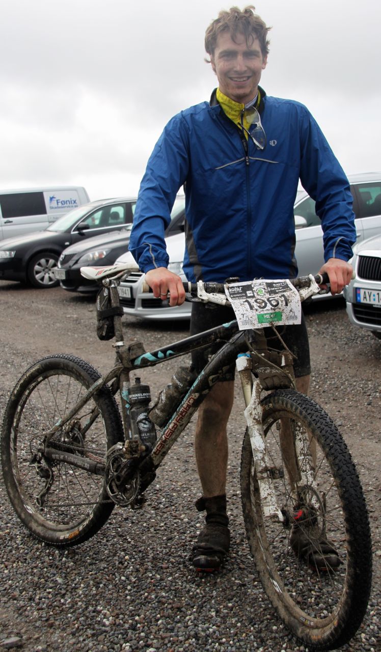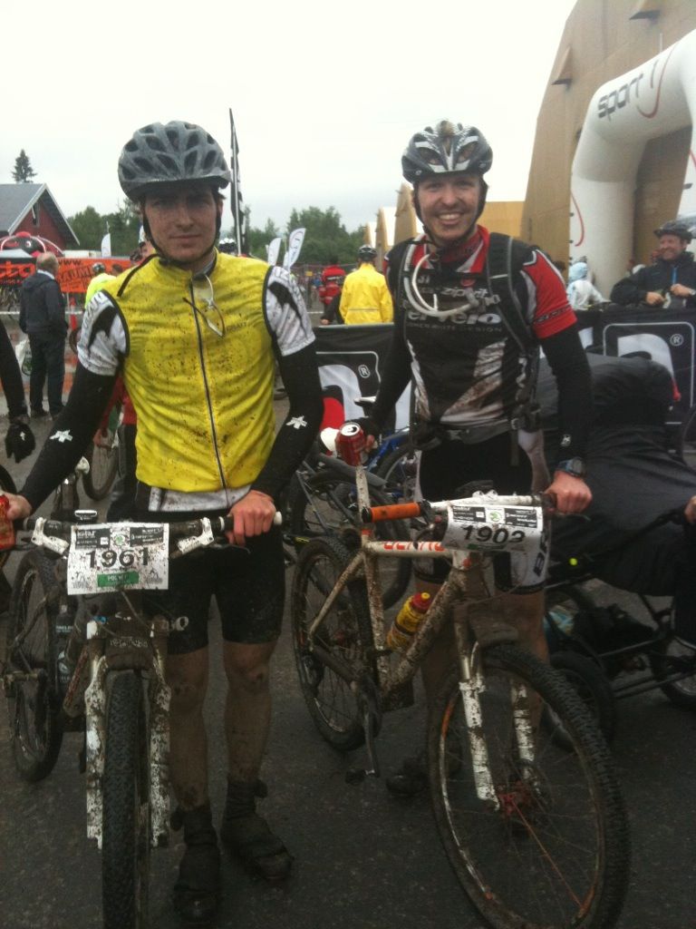 Når startskuddet gikk var vi bakerst i gruppa og etter 3 min var vi i front. Etterpå det så vi ikke mer til de. Først var det bare cruising på asfalt og fin grus før vi kom til dagens først utfording, gjørmehull nr. 1. Det var gjørme til midt på leggen og med mange gående syklister i løypa var det umulig å sykle. Da ble det løping/gåing. Langt. Å hoppe av sykkelen og begynne å løpe burde vært midt i blinken for meg, men dessverre. Gjørmebryting med deg selv og sykkelen er overvurdert! Etter 10 min med å leke G. I. Joe i skauen var det sykling som igjen var på agendaen. Vi holdt god fart og Kim hang godt med, selv om jeg syklet det jeg var godt for med puls på terskel og beyond. Etter 18 km var det klart for dagens andre utfording, gjørmhull nr. 2. Samme gjørma og samme gåing, bare lengre. I nesten 18 min var vi i gjørmeparadiset før vi igjen fikk satt oss på syklene. Da var det bare gi gass til dagens tredje og siste utfording. Bakken ned fra Gruvlia. Mange stor og halvstore skarpe steiner gjorde nedkjøringen utfordende og når frembremsen slutt å virke var jeg lettelsen stor når jeg først kom med ned, med uten punktering eller brukket kragebein. I resten av rittet var det bare kjørestyrken som gjaldt og der gikk det helt greit. Vi kjørte hardt, men kontrollert og kom inn til tiden 3:24:17.  Det var vi svært fornøyd med, spesielt med det været som hadde herjet i forkant og den svake startsposisjonen vår. Jeg må si at jeg er meget imponert av brodern som holdt hele veien. Jeg dro mest, men i motbakkene hjelper det lite og selv om jeg lå med puls på 175 BPM, og rett i underkant av min spyterskel, dro han i fra i oppoverbakkene. I Fredagsbirken i fjor slo jeg han tross alt med nesten 50 min så dette var en stor forbedring! Jeg gleder meg til å se hvordan han gjør det i årets Fredagsbirken 🙂
