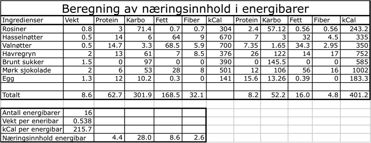 Med 840 g fordelt på 16 energibarer vil hver energibar veie i snitt 54 g (minus fordampet fuktighet som ikke vil påvirke næringsinnholdet). Med oppskriften over så vil energiinnholdet være 8,2 g protein, 52,2 g karbo, ,16 g fett og 4,8 g fiber og 401 kCal per 100 gram. Nedenfor er bildet av Excel-kalkulatoren og hvis du ønsker å bruke den for å beregne næringinnholdet for din energibarer så kan du laste den ned her ved å klikke på denne lenken: Beregning av kalorier energibarer.xlsx. Bytt ut ingredisenen, legg til vekten i målt i 100 g (altså 80 g = 0,8) og fyll inn næringsinnholdet for den ingrediensen på venstre side. Resten fikser seg selv.