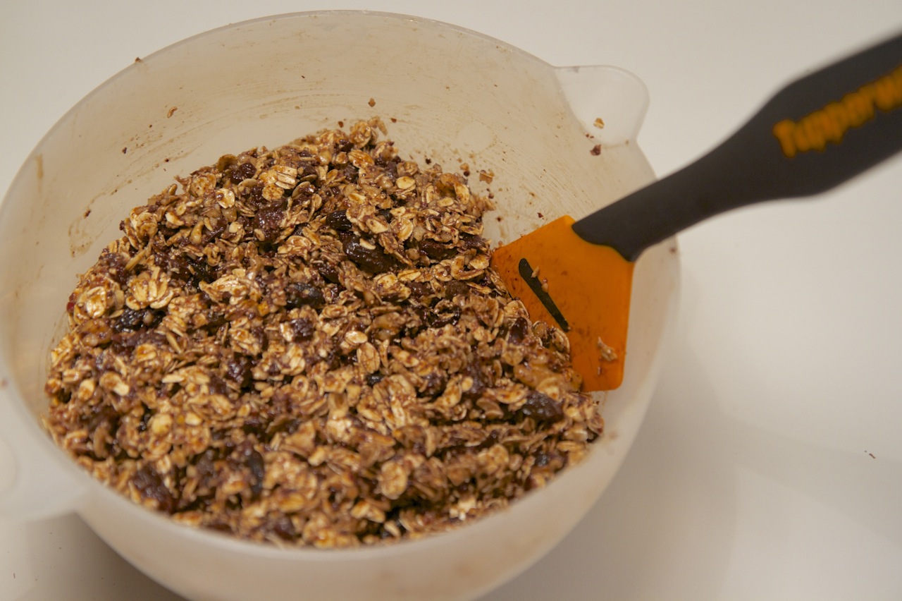 - Ta nøtter, sjokolade, rosiner (annen type tørket frukt) og havregrynnen i samme bolle og rør godt.
