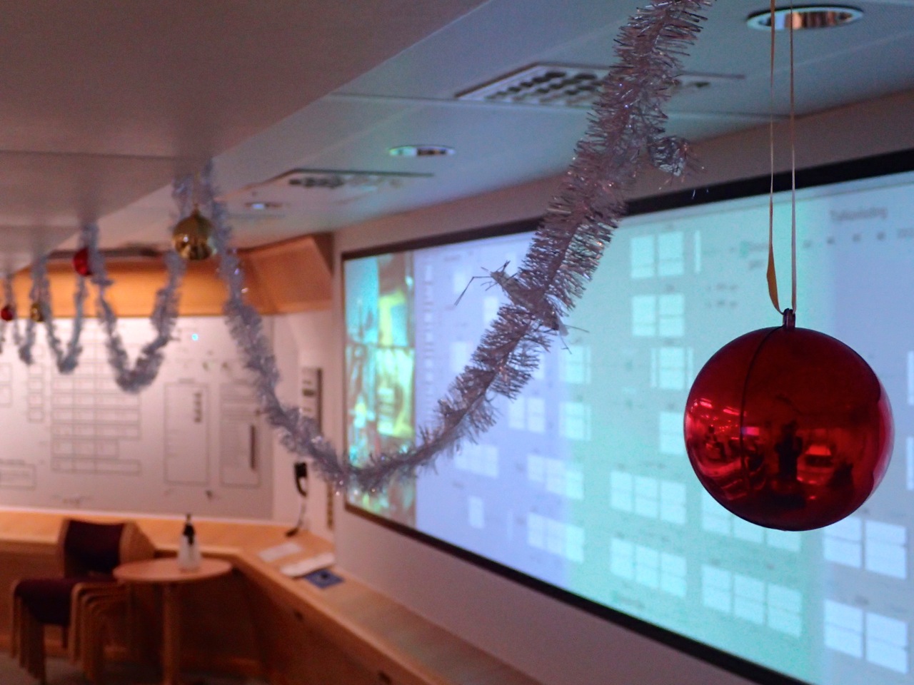 OLYMPUS DIGITAL CAMERAVi har faktisk en egen eske med julepynt til kontrollrommet og med julepynt fra 80-tallet blir det god stemning! Dessverre så fikk vi ikke ombord vårt eget juletre pga dårlig vær så her måtte vi improvisere.