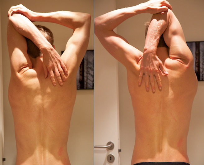 Triallan - Klinikk for Alle - Svømming - Fleksibilitet - SkadeforebyggningDette er hvor langt (eller kort) jeg klarer å få armene mothverandre bak på ryggen. Igjen ser du at venstrearmen ikke er i nærheten av å komme så langt inn og nedover som høyre når den er overarmen, men at den faktisk kommer lenger opp på ryggen enn høyre når den er underarmen. God fleksibilitet kan det uansett ikke kalles!