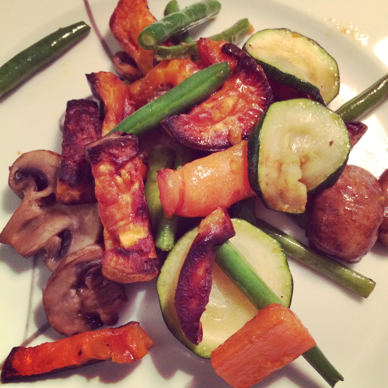 Restefest – På lørdag så hadde vi ingen plan på middagen foruten om å se om vi klarte å tømme kjøleskapet for matvarer. Vi hadde søtpotet, squash, gulerøtter, champinjong og grønne bønner, som vi ovnsbakte. Veldig sunt, godt, billig og miljøvennlig 😀