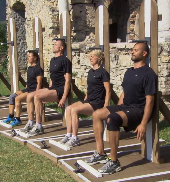 90 grader handler kort og godt om å stå i 90 grader inntil en vegg så lenge som mulig. Statisk lårmusklatur er tingen, og noe som kanskje burde passe syklister/triatleter bra? Knut ble ikke den sterkeste her og måtte kast inn håndkle etter 4 min og 37 sek og Susanne Goksør blir stående som vinner med tiden 5:13. Dette var tydeligvis en øvelse som passet meg bedre for lårene mine kollapset ikke før 6 min og 8 sek 😀