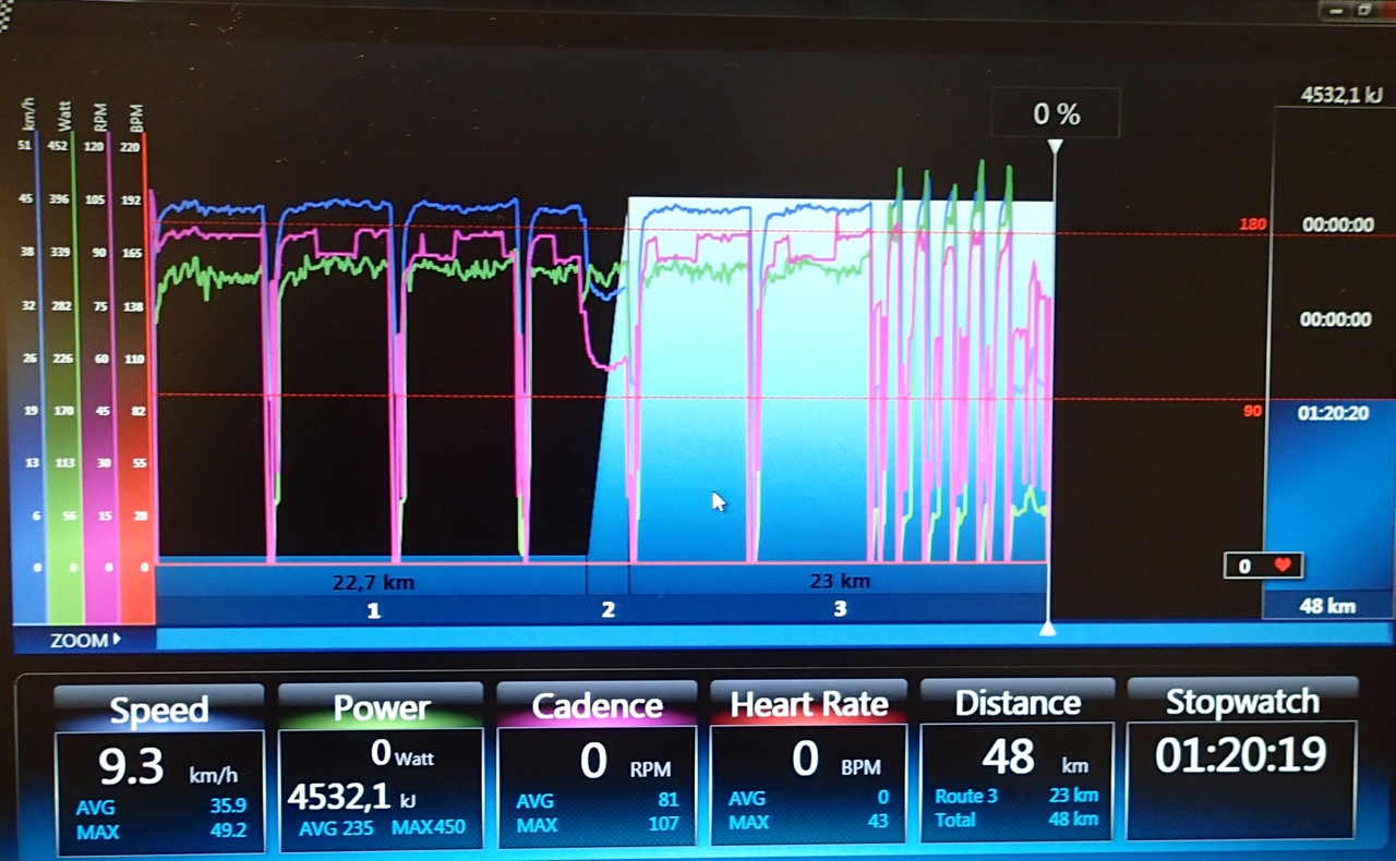 Når det gjelder intensitesstyring uten wattmåler, så ville jeg kjørt på følelsen og sjekket pulsen utover økta for referanse. Prøv å kjenn etter neste gang du kjører intervallene (med wattmåler) og kjenn hvor tungt de forskjellige dragene føles ut. Om du har det som meg så føles intervallene hakket tyngre og tyngre for hver intervall med svakt stigende puls hele veien (med jevn watt). Om du også har det slik så prøv å gjøre det samme uten wattmålering.