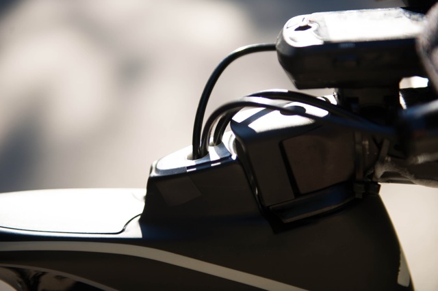 Her er lokket som kan byttes ut med en drikkeblære. Løsningen er smart både i teorien og i praksis, men jeg klarer meg med en drikkeflaske med vann mellom styrefremspringene siden jeg ikke tåler sportsdrikk.
