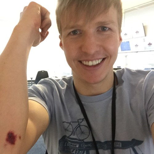 En trøtt tirsdagsmorgen, en vindfull dag og et sekunds uoppmerksomhet klarte å sende meg parallelt over en 15 cm fortauskant mens jeg syklet til jobb. Litt uflaks men hovedsakelig sløvhet og 100 % egenforskyldt. På rent instinkt sjekket jeg umiddelbart sykkelen og den kom overraskende godt ut av fallet. Det var ikke så rart da kneet, albuen og skuldra mi tok mesteparten av energien fra fallet.