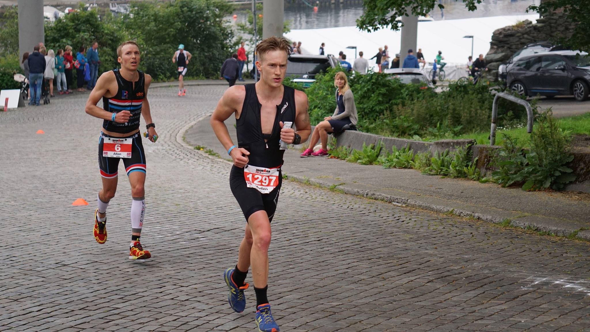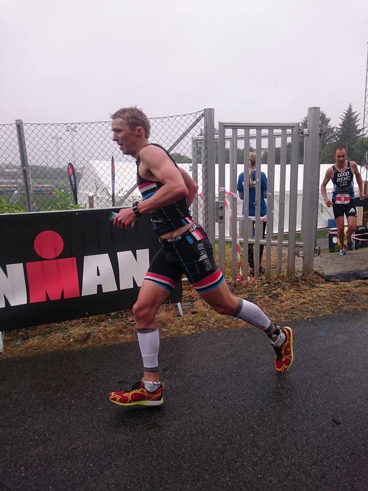Å ligge på 10-metern (12 meter fra forhjul til forhjul) er mye lettere enn å sykle alene. Derfor fristet det veldig å komme opp til Per Morten Ellingsen som lå ca. 30 sek foran meg på syklingen, men det høres mye lettere ut enn det var, fordi han kjørte hardt og selv om jeg også lå like under 300 watt så klarte jeg ikke å ta innpå. Tenkte flere ganger at nå må du pokker meg ta deg sammen Allan og gi jernet i 4-5 minutter for å ta han igjen, men samtidig så var det muligens ikke så lurte å ligge så lenge over terskel for å få det til, og dessuten kjentes det ikke ut som jeg hadde skikkelig trøkk i beina. Derfor tok det over 25 kilomterer før jeg tok han igjen, og etter å ha roet litt ned, fått i meg ernæring så forsto jeg at jeg måtte i front for å dra opp tempoet om jeg skulle ha noe i NM å gjøre siden de aller fleste av konkurrentene mine var foran. Der ble jeg mer eller mindre liggende frem til rett før vi svingte ned til Haugesund ved rundt 68 km. Da kom Dag fra Team Kjekkas forbi i en rasende fart og det var min reddende fartsengel da jeg klarte å holde meg på 10-metern mens de andre falt av. Med en sykkeltid på 2:13:23 så syklet Dag faktisk nesten 2 minutter raskere enn Richie Nicholls som vant, og hans tempo passet meg perfekt! Inn på sykkel på 2:19:09 og med en snittwatt på 269 og 276 NP og 158 i puls. Som i Sør-Afrika så klarte jeg igjen å tryne når jeg skulle av sykkelen, men da kunne jeg skylde på at jeg ikke hadde forbrems. Hvordan jeg fikke det til nå vet jeg ikke, men jeg var glad det var kunstgress og ikke asfalt jeg landet på 🙂