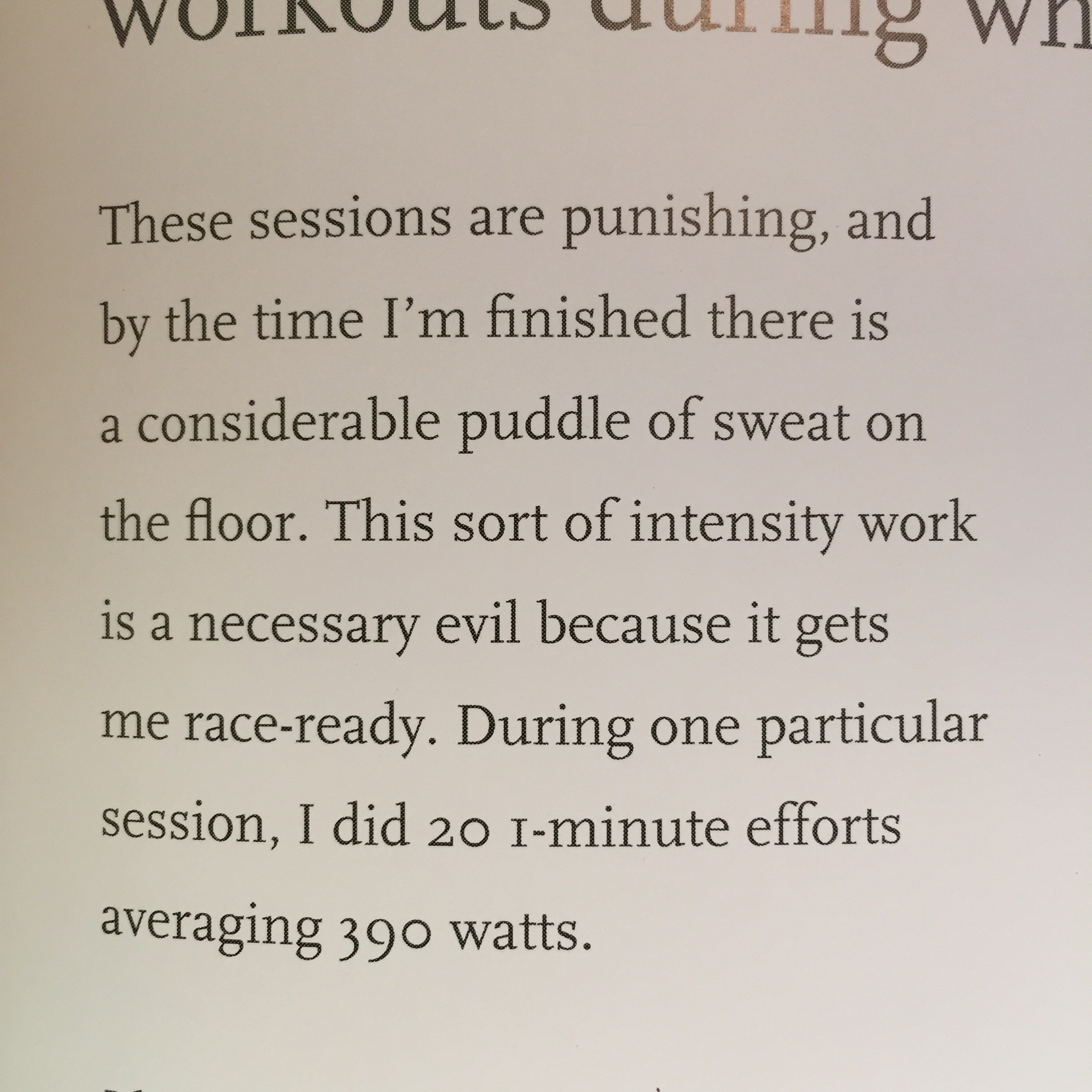 Enkelt fortalt så må overskuddet opp, og da må treningsmengden ned, og for å holde «the sharpness» i kroppen, og gjerne øke VO2-maks så trener jeg mindre og rolig med innslag av skikkelig hardt kjør. En av øktene jeg lenge har hatt lyst å prøve meg på, men ikke har gjort tidligere, er 20 x 1 min veldig hardt, med 1 min pause. Dette er en økt jeg leste i Craig Alexanders superflotte bildebok As the Crow Flies, der han leste igjennom treningsdagboken og var spesielt fornøyd med å ha kjørt 20 x 1 min på 390 watt. Det kan vel ikke være så vanskelig tenkte jeg, men det er lett å tenke uten å ha gjort det. Vi er samme høyde og vekt så hans wattverdier er absolutt sammenlignbare med mine.