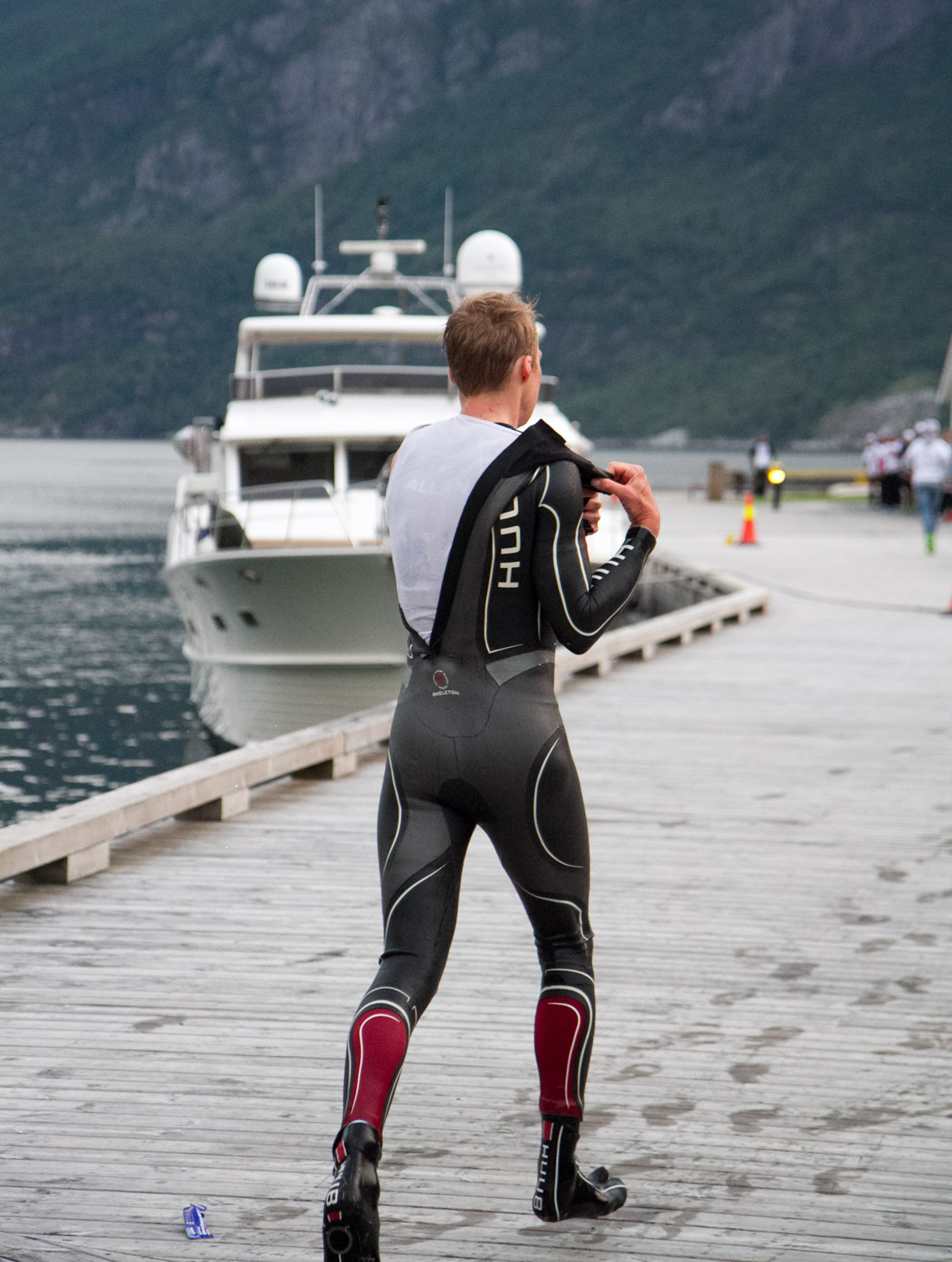 Den lave temperaturen på 10 – 11 grader har vært den store ”snakkisen” uka før Norseman, og selv om det er veldig kaldt så føltes det ikke så ille ut når bekledningen var god og intensiteten var høy. Undertrøye, løse armer og lang neoprenhete med en vanlig neoprenhette over. Neoprensokker valgte jeg også å bruke selv om jeg vet at det koster meg et par sekunder per 100 meter i tapt svømmetid. Oppvarmingen i vannet ble gjort frem til 2 minutter fra start for å ligge å ”sculle” på startstreken så kort som mulig. Norseman er en lang konkurranse, men for min del så kunne den vært over veldig raskt. Det ble som normalt mye kaving i begynnelsen med hard svømming og mye kontakt. Det er jeg jo vant til, men at jeg begynte å hyperventilere samtidig som jeg mistet fullstendig kraften i armene var en ny opplevelse. Jeg klarte ikke å svømme raskere eller med høyere frekvens enn en oppvarming men likevel jobbet lungene maksimalt. En stund så lurte jeg faktisk på om den fysiologisk reaksjonen på anstrengelsen i det kalde vannet gjorde at løpet var kjørt nesten før det var begynt. Med fokus på å få kontroll på pusten, unngå slossing og komme inn i en rytme igjen så gikk det raskt bedre og jeg kunne begynne å sikte mot Eidfjord igjen. Den 1900 meter lange svømmingen ble gjort på 31:42, som selv om jeg ikke er fornøyd med prestasjonen eller tiden så var det rett bak Henrik Oftedal og Lars Petter Stormo, som var de jeg ønsket å ha kontakt med.