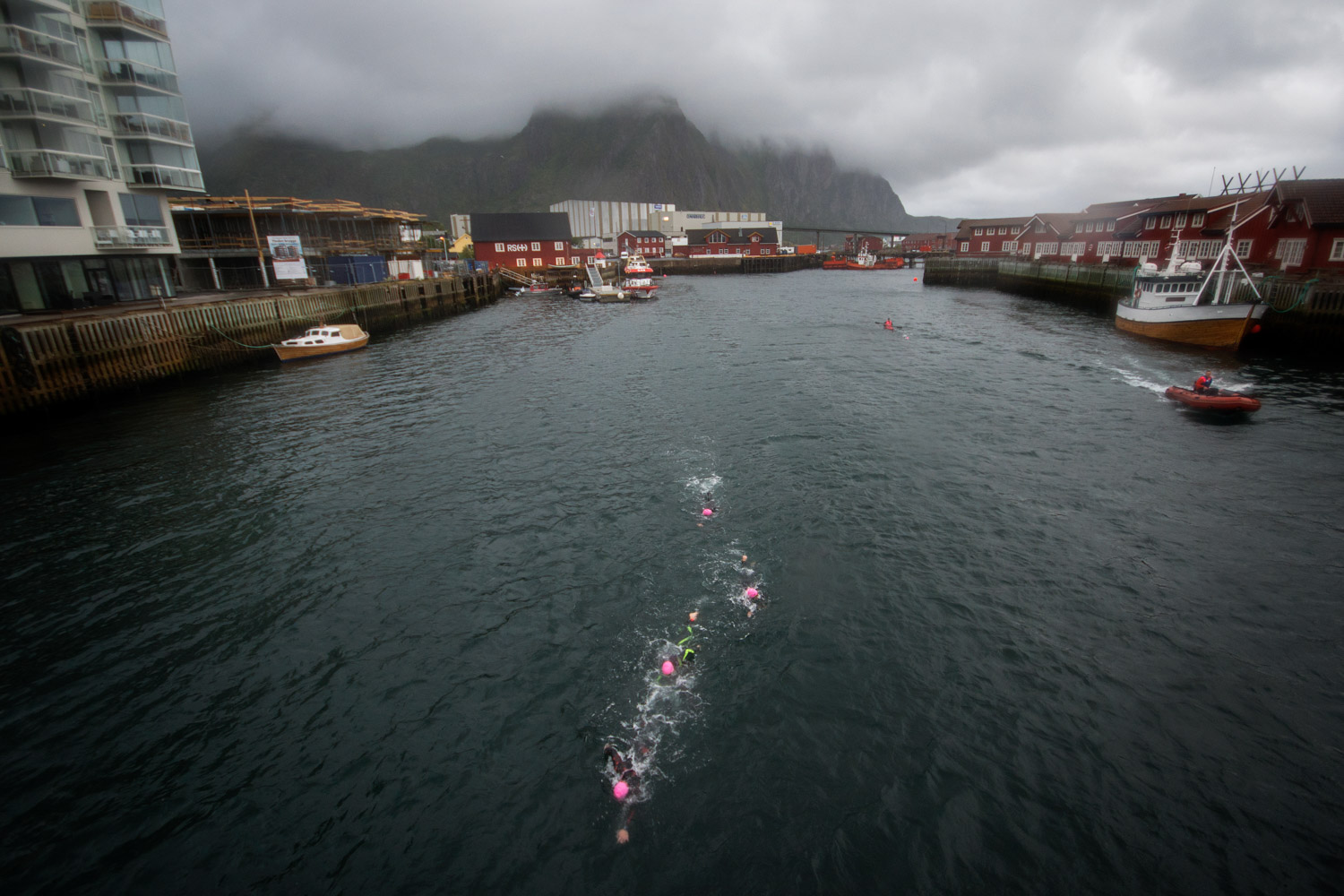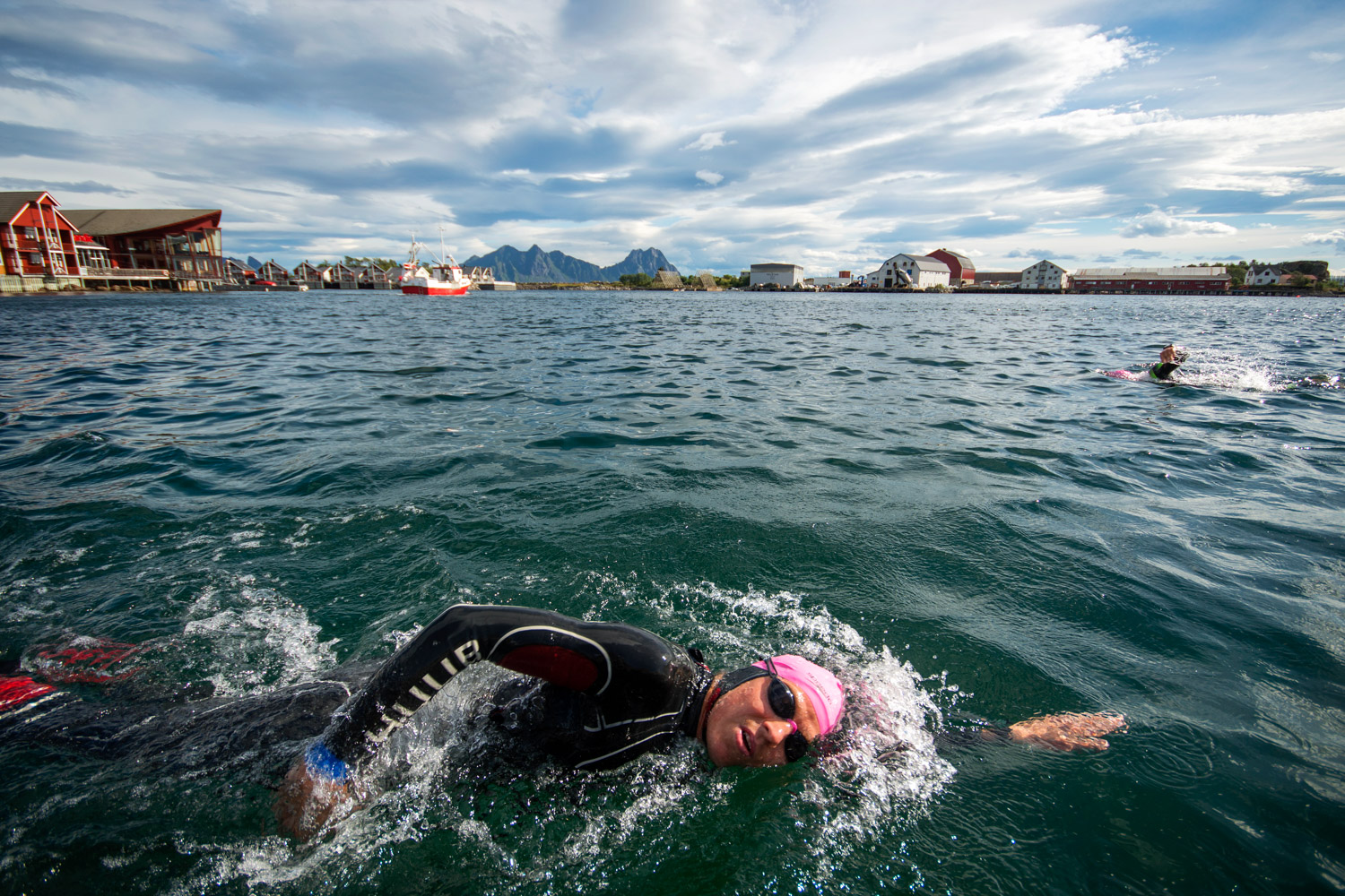 Pga den sterke vinden ble svømmeløypa endret til å svømme inne i havna i Svolvær. Det var for mye vind og bølger til at Hurtigruta kunne legge til og naturlig nok også uegnet for svømming. Det gjorde ingenting for svømming inne i havna var spektakulært samtidig som det var trygt. Med ikoniske sjarker når du pustet til høyre og de bildeskjønne fjellene når du pustet til venstre. Det salte vannet hadde nærmest Hawaii-klarhet og vi kunne se tang, tare og fisker under vann. Vanntemperaturen på over 15 grader føltes rett og behagelig sammenlignet med Eidfjords 10 grader 4 uker tidligere. Det ble en noe kort svømming pga tøffe bølgeforhold ute ved den siste bøyen vi egentlig skulle svømme rundt. Opp av vannet kom jeg derfor på rundt 53 minutter som nr. 2. Tom Arne, som er en tidligere svømmer hadde kommet opp 5 minutter før meg.