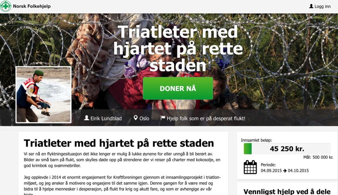 For to dager siden så fikk jeg melding av Eirik Lundblad om å dele hans donasjonsaksjon til støtte for Norsk Folkehjelp sitt arbeid for å hjelpe de som er på flukt. At triatleter har rykte på seg for å være egoistiske var jeg ikke klar over, for triatlonmiljøet er nok blant de hyggeligste og mest inkluderende miljøene som er å oppdrive. Det vet jeg at uansett ikke stemmer, og Eirik sitt initiativ og det betydelig beløpet alle totalt har bidratt med er et godt bevis på det motsatte.