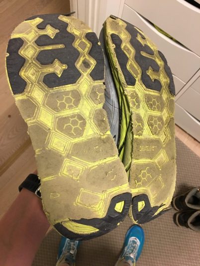 Hoka prøvde jeg for første gang rett før Norseman i 2015, etter å fått en akutt slagskade på undersiden av foten etter en løpetur i terrenget som medførte store smerter i Plantar Fascia. Det var kun 3 uker til Norseman og jeg kunne ikke gå på foten(!) Derfor ble det hastekjøpt et par Hoka Clifton 2, som tilbyr veldig god demping uten at vekten er høy. Resultat ble en løpsetappe på Norseman som var raskere enn noen har løpt tidligere, og uten smerter (på undersiden av foten riktignok. Gnagsårene på yttersiden av lilletærne var konsekvensen av å løpe nesten 4 timer med helt nye sko). Siden har jeg nesten utelukkende løpt i de skoene. De har vært med på utrolig mange treninger og konkurranser og fungert utmerket i alt fra raske asfaltløp til skikkelige terrengløp, til tross for at det ikke er noen terrengløpesko.
