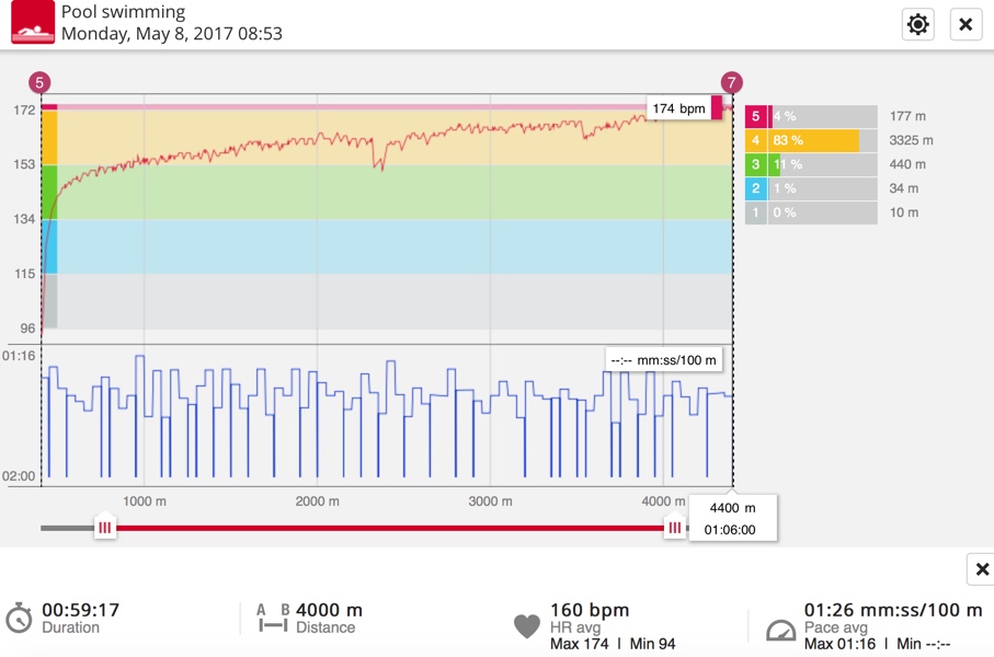 Tiltak har blitt gjort og til tross for litt mindre kontinuitet i ferier og ekstra dager på jobben så har det gitt resultater. «Syretesten» har vært 4000m kontinuerlig svømming i Tøyenbadet. Utstyrsmessig har jeg brukt HUUB Swimskin (for kunne bruke pulsbeltet), kickpants og snorkel. Nå kan det selvsagt diskuteres hvor hensiktsmessig hjelpemidlene er, men jeg føler grunnene til å bruke det er gode, dessuten er det de samme hver gang.