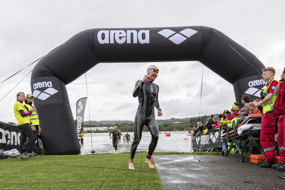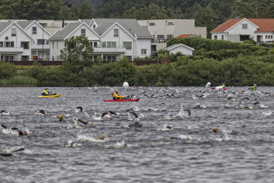 Med rullende start så startet vi 5 og 5, med 5 sekunders mellomrom. Dette er basert på selvseedning. Selv valgte jeg å starte i gruppe nr. 3, sammen med det jeg anså som en av mine sterkeste konkurrenter Hans Christian Tungesvik. Lasse Finstad, som var den andre som jeg anså som største konkurrenter stilte seg helt først og så offensiv ut. Jeg valgte å kjøre mitt eget løp, og ikke la meg rive med i å starte for hardt på svømmingen. Å starte for hard har jeg gjort på hver eneste konkurranse frem til i år, uten spesielt stor suksess. Det ble en god start. Det føltes lett ut, jeg fikk kontroll på pusten og så kontroll på teknikken. Derfra var det lettere å kontrollere intensiteten etter det jeg syntes var passende. Med de ny HUUB Altair-brillene var sikten krystallklar og jeg hadde full kontroll på navigeringen. Jeg hadde kontrollen, i stedet for følelsen av å holde meg i livet, slik jeg har svømt før. Opp av vannet som nr. 5 med tiden 27:31, som er nærmere 2,5 minutter bedre enn det jeg ligget på tidligere, og med en mye bedre følelse og kontroll.