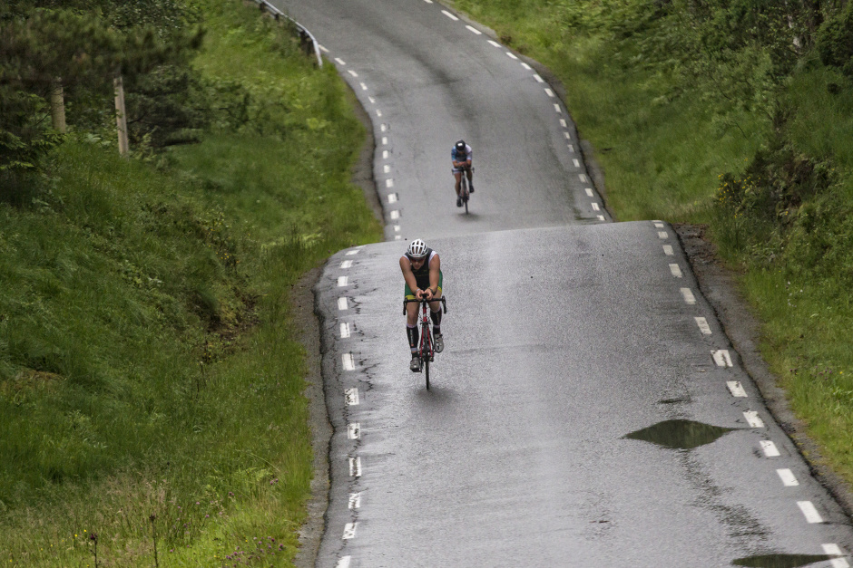 I blogginnlegget før konkurransen skrev jeg at jeg kom til å ta på meg en vest i skiftesonen, men jeg hadde fått i meg en såpass god varme på svømmingen at jeg tok en lynrask avgjørelse om å droppe det. Ullsokker prioriterte jeg, sammen med å ta på meg sykkelhansker mens jeg løp bort til sykkelen. Jeg hoppet (eller riktigere sagt tråkket over) sykkelen, startet rolig for å unngå uhell de første hundre meterne før jeg gav jernet etter at jeg kom ut Fylkesvei 47. Det var kjølige forhold. Den beste medisinen mot kjølige forhold, er å ligge i dyp aeroposisjon og tråkke hardt. Først nevnte reduserer arealet og kjølingseffekten og sistnevnte generer energi og varme. Heldigvis er dette også synonymt med rask sykling. Jeg følte det gikk raskt samtidig som jeg syklet jevn hardt og hadde god kontroll. Etter 5 kilometer passerte jeg nr. 2, og hadde kun en foran meg, nemlig Lasse Finstad. Jeg så han først etter 15 km, og estimerte at han hadde ca. 40 sekunders forsprang, som er mye mer enn det høres ut som. Fokuset ble todelt. Sykle så hardt og effektivt som mulig, samtidig som jeg skulle holde hodet lav og sittestillingen aerodynamisk. Avstanden mellom Lasse og meg var relativt konstant til vi kom til Buavåg, og rett etter drikkestasjonen før 50 km så passerte jeg han og lå i front. Siden jeg sykler relativt jevnt, så betyr det at jeg sykler ”sakte” i motbakkene, sammenlignet med andre. Det prøvde derfor ikke å ”riste av meg” Lasse på den strekningen. Når jeg kom ut til Fv47 igjen var det derimot slutt på bakkene og de tekniske partiene, og da var det bare en ting å gjøre; legg hode lavt og tråkke på. Det blåst opp og regnet mer eller mindre konstant. Det passet meg ypperlig. Jeg kjempet ikke mot vinden, men danset med den. Syklet midt i veien og føyde meg i vindkastene. Jeg økte forspranget derfra og holdt bra trøkk videre. Regnværet gjorde at jeg var ekstra forsiktig i svingene nede i Haugesund og enda mer forsiktig når vi syklet den siste runden etter 70 km, der jeg er mindre kjent. Jeg ønsket selvsagt et stort forsprang ut på løp, men enda viktigere var det å unngå fall, så jeg tok absolutt ingen sjanser. Syklingen føltes veldig bra og kontrollert ut, og jeg viste at jeg syklet bedre enn de andre. Det er en god følelse!