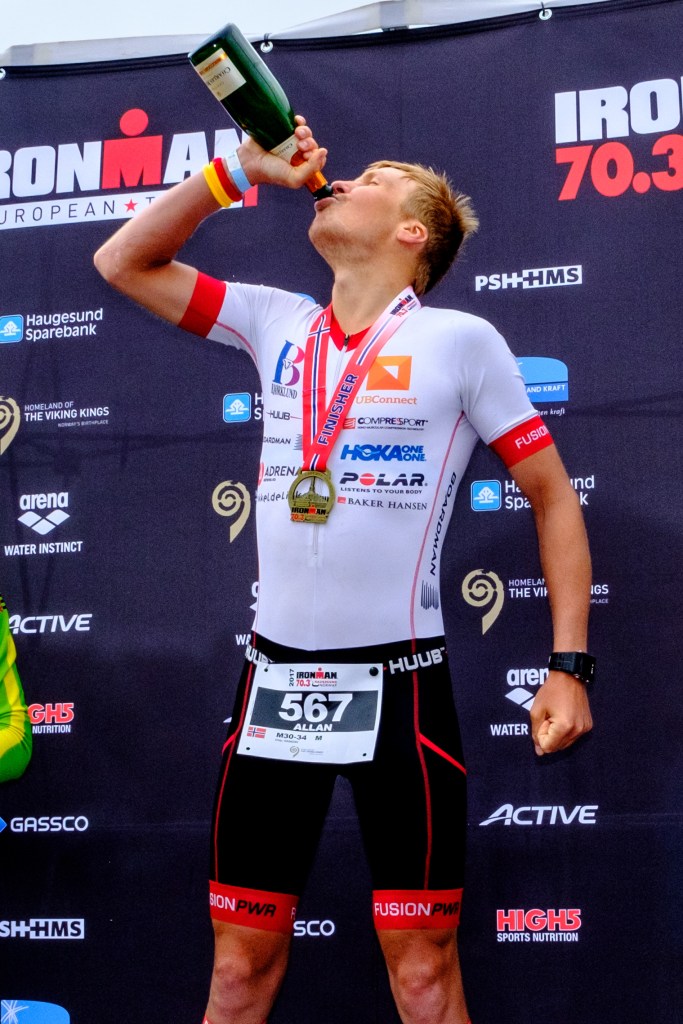 Ut fra skiftesonen løp jeg akkurat i det Lasse kom inn på sykkel og jeg anså forspranget mitt som ca. 2 minutter. Jeg løp ut i god fart og med en god følelse. Problemet viste seg bare at farten ikke var god. Langt ifra. Persen min fra Haugesund var 1:15:41, men da med optimale forhold (aka en sterk løper som pustet meg i nakken hele veien og pushet meg maksimalt), men jeg tenkte at 1:17 skulle jeg klare greit uten større problemer. Den farten hadde jeg overhodet ikke, og jeg forsto ikke hvorfor. Muskulært føltes alt bra, energinivået var ok og jeg følte jeg løp lett og fint. Det gikk bare ikke så raskt som jeg ønsket. Ved vending etter 6 km kunne jeg beregne at Lasse var i underkant av 2 minutter bak, og jeg tenkte; shit, her må du få opp farten ellers så taper jeg en seier jeg på alle måter burde sikre uten problemer. Etter vending med parken ved rundt 11 kilometer traff jeg Lasse på vei tilbake og var da nesten 4 minutter foran. Da viste jeg at ingen kunne ta meg igjen. På en måte var det en god følelse å vite at seieren var min, på en annen måte syntes jeg synd på Lasse samtidig som det var synd for min egen motivasjon for å ta ut alt. Det er i slik stunder at du leiter etter unnskyldninger for å ikke påføre deg så mye smerte. Det er da alle ”lure tanker” kommer opp, som f.eks. at det er greit å ta det rolig for å redusere den muskulære belastningen, redusere restitusjonstiden etc. Det var en fantastisk siste runde og jeg fikk utallige heiarop underveis, både fra publikum og deltakere. Det var rett og slett rørende og det hele eksploderte i det jeg traff kaien for siste gang. Mamma stod der med de digre norske flagget og lurte på om jeg ikke vil ha det. Ja, hvorfor ikke? Gåsehuden var maksimal der jeg ble løftet frem av en speaker og publikummere i verdensklasse, og løp over mållinjen som den første lokale utøveren som vinner av Ironman 70.3 Haugesund. Tro meg, når jeg sier at det var en helt sjuk og surrealistisk opplevelse.
