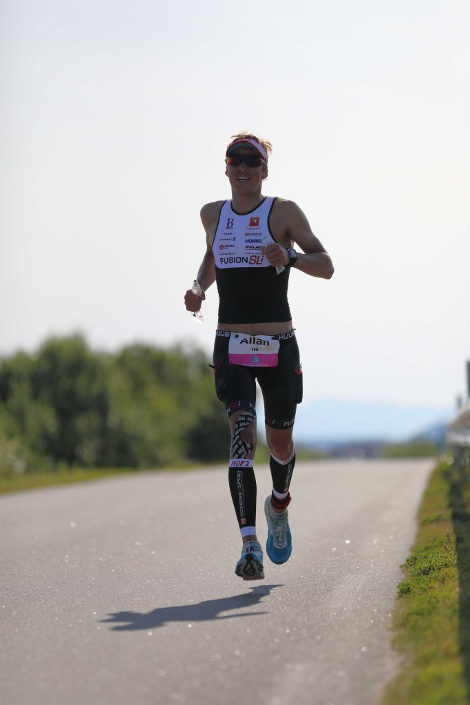 Det er kun ca. 1400 høydemeter på sykkelløypa i Lofoten, og høydeprofilen kan beskrives som lett rullende. Etter 16 kilometer passeres veien ut til turistmagneten Henningsvær, og det er 150 kilometer sykling igjen før den veien skal sykles. Det lette skydekket forsvant og morgensolen lyste opp fjellene. Det gav en perfekt refleksjon i det blikkstille havet der hver lille rorbu kunne se sitt eget speilbilde. Det hele toppet seg når den kom en havørn flygende over meg og da tenkte jeg; ”Jenny, nå selger vi leiligheten i Oslo og flytter til Lofoten!”. Med en skyfri himmel og fullstendig vindstille viste landskapet seg fra sin aller vakreste side, og gåsehudfaktoren var maksimal. De langstrakte veien med god asfalt og lite trafikk er perfekte for å gjøre det jeg gjør best. Sykle med jevnt trykk på pedalene med hodet så lavt som mulig for optimal aerodynamikk. Utfordringen var at utsikten gjorde det så utrolig vanskelig å se rett ned i asfalten. Personlig var jeg spent på hvordan det skadde låret ville fungere, og hvordan muskulaturen var bare to uker etter Norseman. Min umiddelbare konklusjon var at styrken og overskuddet langt ifra var på topp, men at det ikke var smertefullt, som var det viktigste. Det var nydelige forhold over Gimsøybrua og vi syklet forbi Lofotr Vikingmuseum, som utenom akkurat under konkurransen er verdt en stopp. Ved Leknes ventet verdens beste omelettkokk, Ragnhild som jobber på Thon Hotel Svolvær, med en vannflaske til meg og jeg kunne fortsette med full trøkk videre ut mot Stamsund. Når vi nærmet oss Gimsøya, den flateste av den relativt flate løypa så var det lite som minnet om full trøkk. Pulsen lå jevnt i høy sone 3, mens watten ebbet gradvis nedover. Det tyder på muskulær utmattelse, og at jeg langt ifra var helt upåvirket etter Norseman med påfølgende dårlig restitusjonsperiode pga fallet på sykkel. Veien ut til Henningsvær er legendarisk og normalt en fryd å sykle, men etter 166 kilometer så fristet ikke stort. Motvind på vei ut og motvind på vei tilbake var følelsen, selv om jeg i ærlighetens navn tror at det var medvind på vei ut. På vei tilbake til Svolvær var det hvertfall motvind, og det var en god følelse å endelig tilbake til skiftesonen på Svolvær torg, der stemningen var enda mer ekstatisk enn etter svømmingen. Jeg var langt foran nærmeste konkurrent og hele 36 minutter foran skjema sammenlignet med fjoråret (godt hjulpet av en solid feilsykling da). Dette skulle gå lett!