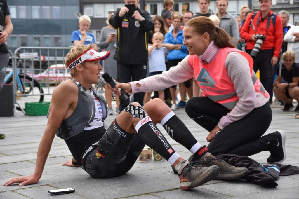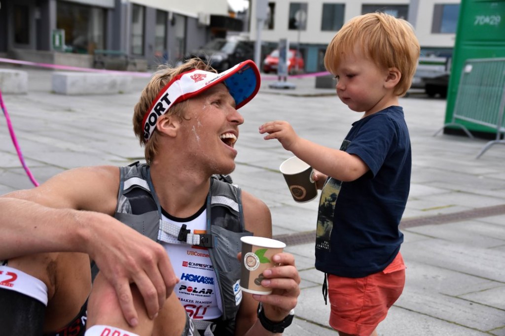 Nedover fikk jeg følge av to hyggelige fyrer som hadde deltatt på den Olympiske distansen dagen før. Du må bare gi beskjed om vi forstyrre dæ, sa den ene. Nei, overhodet ikke svarte jeg. Etter å ha konkurret «alene» hele dagen var det svært hyggelig med selskap og det lave energinivået til tross så var jeg skikkelig pratesjuk. Når du er nede fra Tjeldbergtind og har kommet deg til Esso-stasjonen er det bare den 3 kilometer lange sjarmøretappen igjen. Selv der så var jeg sannlig ikke sikker på at jeg kunne holde meg løpende helt til mål, så sliten var jeg. Å kjenne treverket under foten er en vannvittig god følelse. Da er du på Svolvær kai og har bare et par hundre meter igjen. Du hører speakeren runge fra torget og publikum er i ekstase. Jeg er også i ekstase, men det synes ikke like godt utenpå som vanlig. Jonas står klar og vi løper over mål til seier og ny løyperekord, med 2 minutter. Etterpå så må jeg bare legge meg ned på de varme steinhellene og der blir jeg liggende. Faktisk kan jeg ikke huske å noen gang ha vært så sliten tidligere. Heldigvis ikke så sliten at jeg ikke kunne gi en liggende klem til Jonas og Jenny, og et nærmeste liggende intervju til Lofotposten (gjengitt av Haugesunds avis i denne artikkelen). Fullstendig ferdig, men utrolig tilfreds og overlykkelig over den fantastiske opplevelsen.