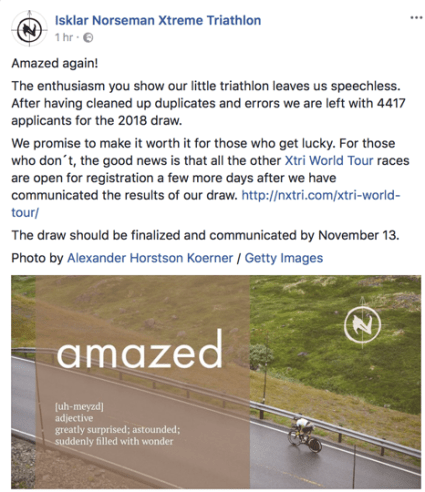 Det er utrolig kult at hele 4416 andre også valgte å «melde seg på», eller rettere sagt ta ett lodd i påmeldingslotteriet. Gratulerer til Norseman for ny påmeldingsrekord!