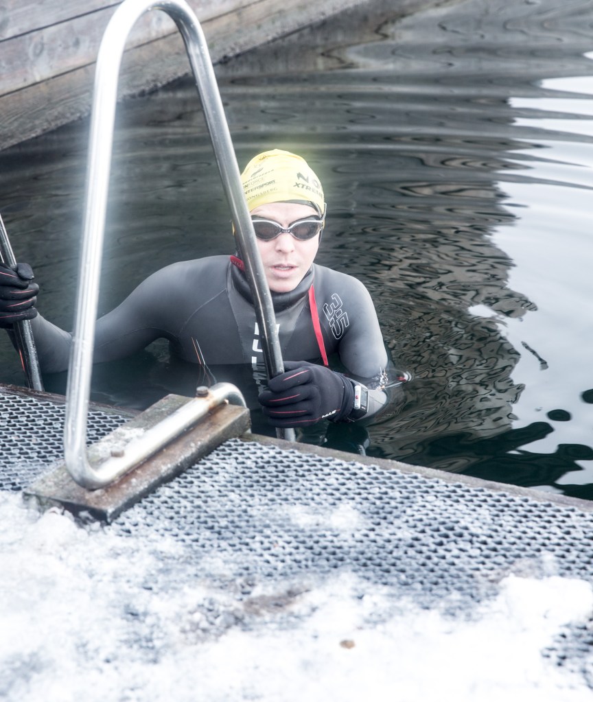 Today I swam 10 minutes and 50 seconds in 3 degrees water with about minus1-degree air temperature. That went better than feared and I could have been swimming longer. The weakest link was my fingers, which went from being numb to start hurting. The HUUB gloves are not made for that low temperatures so with thicker gloves, it would have abled me to stay in considerably longer. With a pair of wool sock inside the neoprene socks I actually believe that I could have stayed in for a whole hour. With a semi-thick wool shirt under and one HUUB Balaclava with two HUUB Scull caps over the rest of the body felt rather ok.