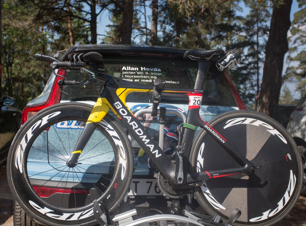 På taket– Takmonterte sykkelstativ er en noe rimeligere løsning enn hengerfeste. Det er også relativt enkelt å sette den lette konkurransesykkelen på taket, og den er enda bedre beskyttet mot grus og salt enn montert bakpå, selv om den blir skitten i vått vær. Ulempene er flere. Den aerodynamisk motstand øker, som gir betydelig økt forbruk av drivstoff. Den bruker takplass som kunne blitt brukt til takboks, skistativ etc. Har du en tung sykkel, som f.eks. vår elsykkel på drøye 20 kg, så vil det i tillegg være vanskelig å få løftet den opp på stativet. Den aller største ulempen er likevel risikoen for å kjøre inn i en garasje/parkeringshus med sykkelen på taket. Det kan ødelegge sykkel, stativ og taket på bilen. Tidligere redaktør i Terrengsykkel sa en gang at det er ikke snakk om hvis, men når du glemmer deg. Personlig tror jeg ikke statistikken er så dyster, men anser sannsynligheten til rundt 70-80 % for at det hadde skjedd meg. Normalt er jeg ikke veldig glemsom, men med dårlig tid og hylende unger er det stor sannsynlighet for å gjøre feil.
