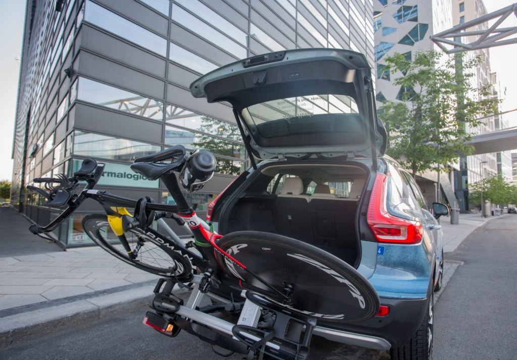 Inne i bilen– For sykkelen er dette den beste løsningen. Det er skånsomt med tanke på eksponering for regn, grus og potensielt salt i vinterføre. Det er også en sikrere løsning med tanke på tyveri om du må la bilen stå uvoktet. Hvis jeg har plass til det velger jeg som regel denne løsningen. Ulempene er nettopp plassen. Den tar store deler av bagasjerommet og jeg må legge ned to av baksetene. Kombinasjonen oljete kjede og hvitt skinninteriør (som jeg har i min Volvo) er ikke heller alltid den beste, så her er det fornuftig å ta med et gammelt pledd eller håndkle for å skåne interiøret. Hvis du driver med terreng- eller stisykling og skal frakte en svært skitten sykkel så kan en transportabel høytrykksvasker være å anbefale. Med tanke på sikkerhet så bør du også ta en vurdering hvor sykkelen og forhjulet, som jeg må ta av, vil havne ved en eventuell bråbrems eller i verst fall krasj.