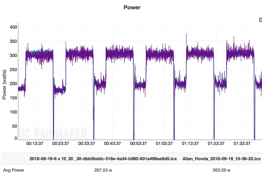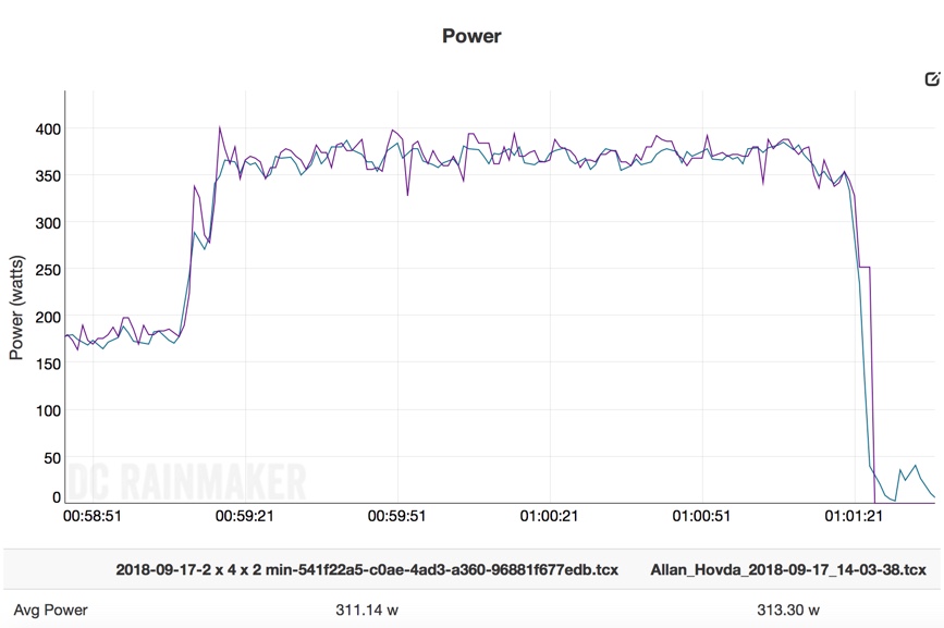 This is the same test as above, just zoomed in on one interval. You can see how close they follow together. If you are using Wahoo Kickr however it may not look this way. The reason is that they smooth out the readings instead of showing the raw numbers.