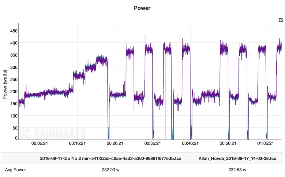 Here you could see a comparison of the measured watt from Tacx Neo and Assioma – (the purple with the file name starting on Allan_Hovda is Assioma measuring). The link to the test can be found clicking here or on the file above. It is typical that the Assioma shows slightly lower reading the first intervals before getting close to identical. It might be the temperature in either the pedals or the trainer, but I do not find it problematic.