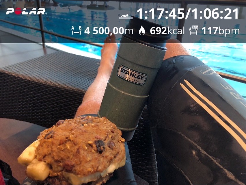 Since an injury in my calf has prevented me for running I had really put the intensity in swimming (and biking as well, but that is as usual). My Polar V800 watch says I used 692kcal, but I use a OH1 optical HR sensor as well and get the true intensity, with an energy consumption of 1200, 1400 and 1100 for the three swim sessions. With two or more sessions each day and often less than 1 hour apart it is really important to get your food intake correct. In my case it is müslibuns with peanut butter, honey, banana and cocunut oil.