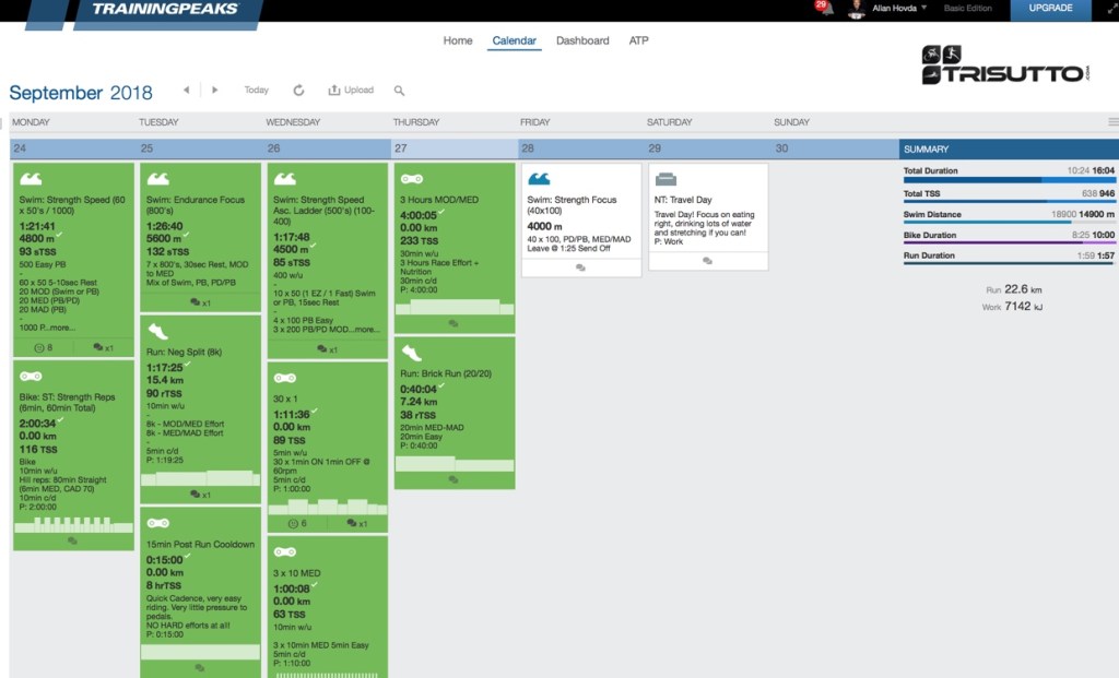 I just thought I would share my training the last week before the last week prior to Ironman Barcelona 7.Oct. The training sessions are planned in detail of my coach Carson Christen in Trisutto & Torden Multisport.