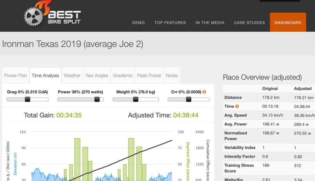 35 minutes is a lot but does not sound that much either. If I use the fabulous calculator of my sponsor BestBikeSplit we can calculate how much more power «Average Joe» would need to produce to compensate for poor aerodynamics. My average Joe weighs 76 kg, with an aerodynamic drag of 0,315 and just under 200watts in average power output thru the 178,2 km of the Ironman Texas course. In order to ride 35 minutes faster, he has to produce 71 more watts(!).
