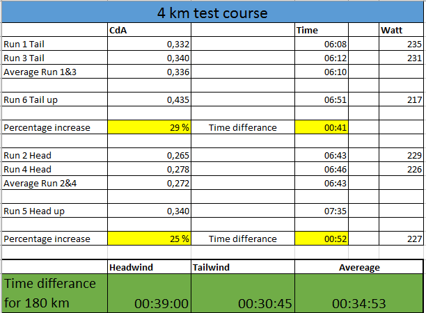 It was a windy day, which unfortunately makes the results more «noisy». I did, however, rode the stretch both ways. Then we can also see that the difference in headwind is bigger than tailwind, which is logical. The loss at tailwind was 41 sec, with 15 watts lower power output. At headwind the difference was 52 sec with close to identical power. Over 180 km the loss at headwind would be 39 minutes and at tailwind less than 30 (the result of 30:45 is included a 15 min loss of power equivalent to 6 minutes time loss). In average roughly 35 minutes lost of sitting upright in mixed wind conditions.