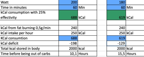That would be true if we did not take into account that in order to increase the average power with 10 %, you also have to use at least 10 % more energy. In the excel sheet below I have calculated how long time you have before running out of energy at 200 watts compared to 180 watts output. In my calculations, the 200 watts will give nearly 200 kCal deficit each hour, and last just over 10 hours. The 180 watts in the other case will only go with 129 calories deficit each hour and last 15,5 hours, 50 % longer.
