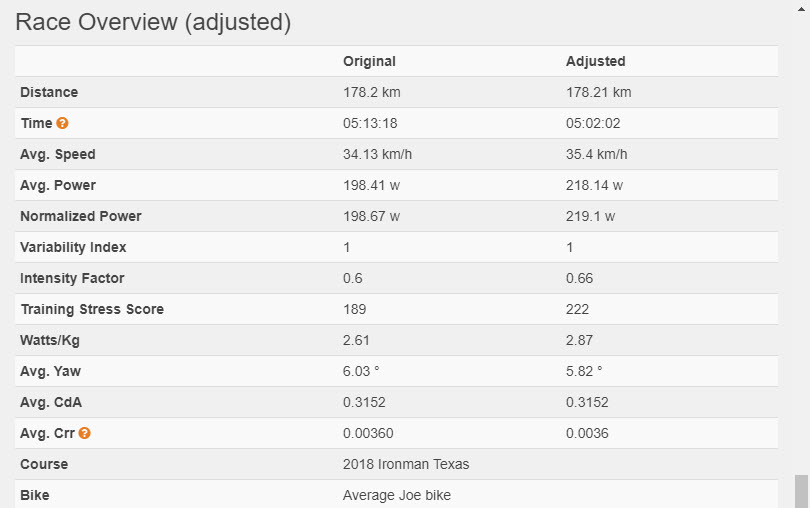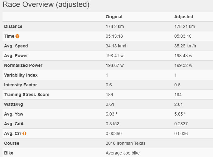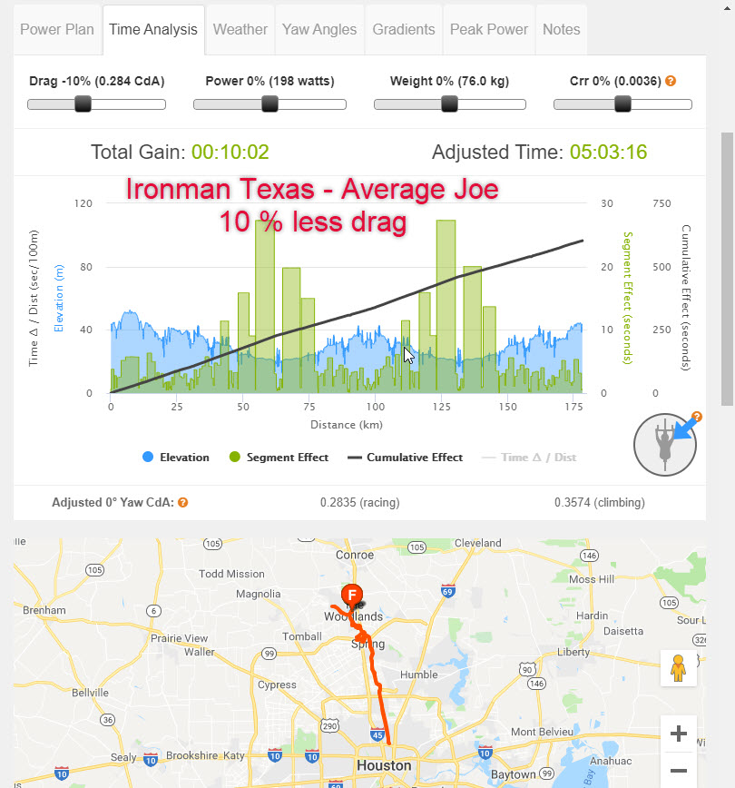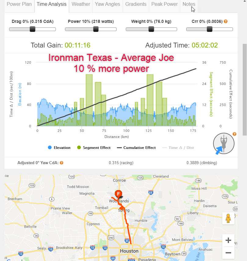 This could all be solved by relatively simple math. Then the answer would be overly theoretical. Instead, I choose to use super complicated math with BestBikeSplit, one of my sponsors, calculating the differences with the rider «Average Joe» in two different courses. One is the flat Ironman Texas and the other is the hilly Norseman bike course.