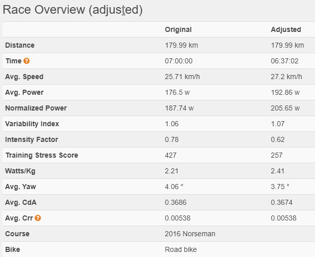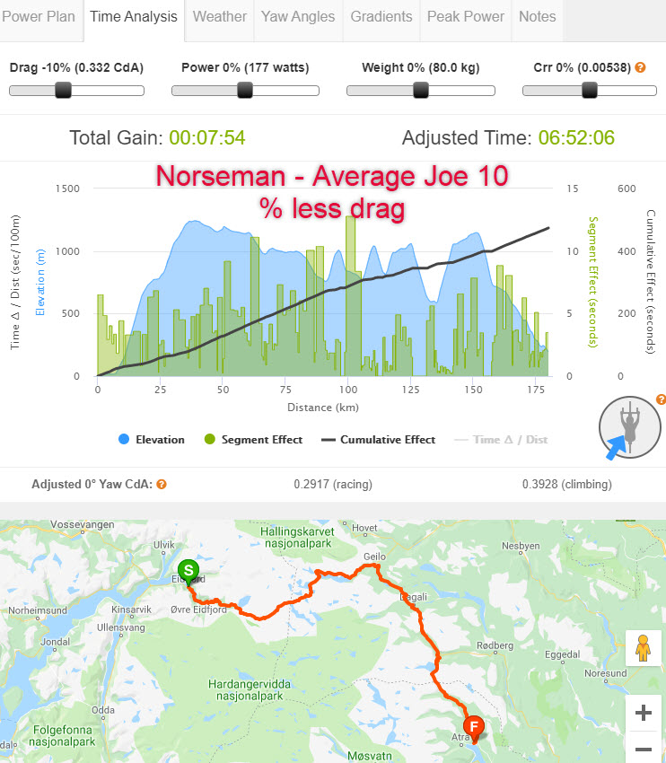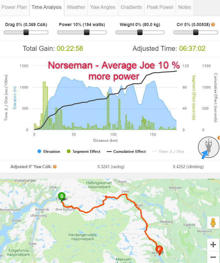 A whopping 22 minutes and 58 seconds can be made in Norseman by increasing the watt with 10 %.