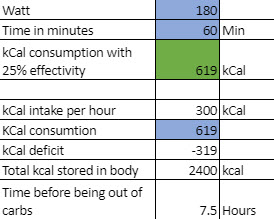 The calculations are overly simple (maybe the amazing number crushers in BestBikeSplit should make a nutrition calculator as well), and in real life, it would be different factors playing a part. Still, if you are going to push more watt, you are going to run out of energy faster. Available energy is a limiter for everyone doing an Ironman at one point unless you are the unlikely case of having a very good fat utilization and ride with low watts.