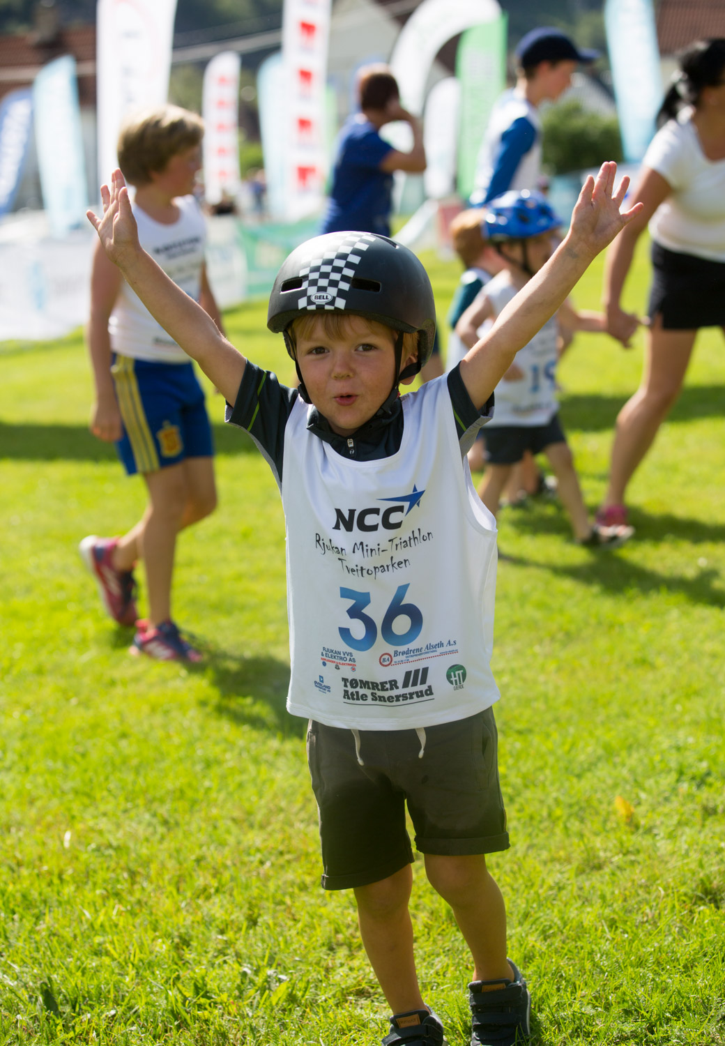 Hvis du har barn i aldersgruppen møt opp til en skikkelig morsom dag. Jonas debuterte i sin første triatlon rett etter Norseman, Rjukan minitri. Det var stor suksess og han hadde det veldig moro. Ikke minst fikk han en medalje, t-skjorte og en halv banan i premie 😀